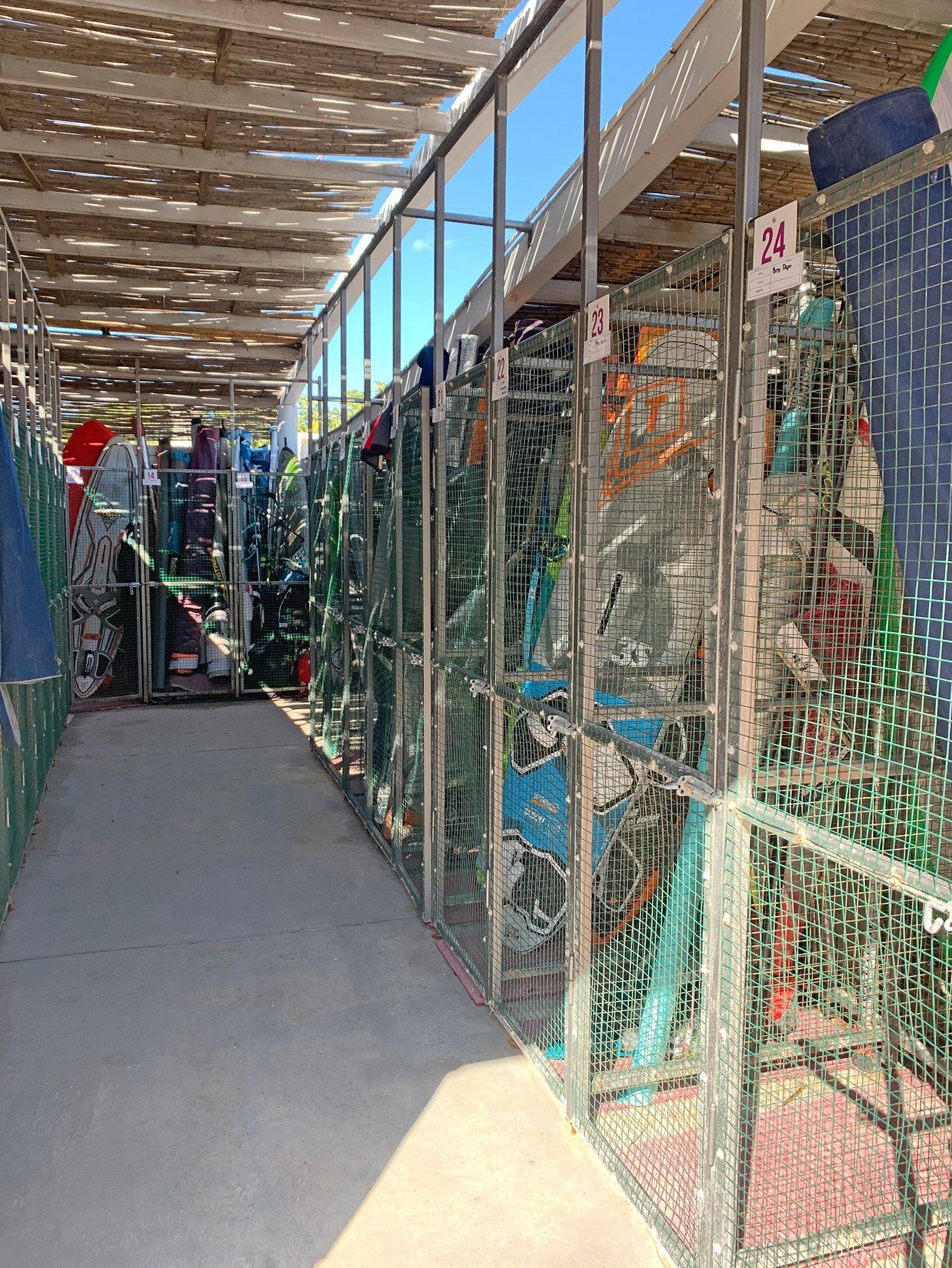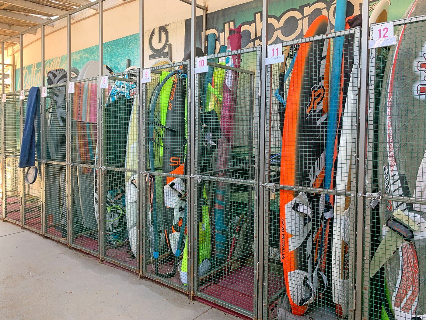 Ваши доски и паруса безопасно хранятся в открытой зоне под защитой системы безопасности. Каждый отсек вмещает 1 доску и 2 паруса, один из которых может быть собран и быть готовым к использованию. Услуги команды спасателей включены в стоимость.